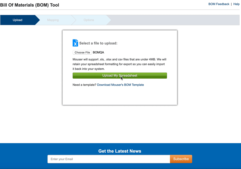 To be compatible with Mouser's BOM Tool, the spreadsheet file must meet the following criteria: